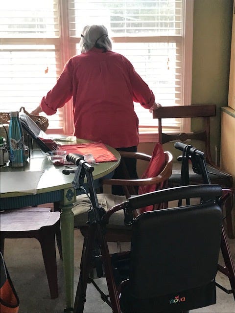 Prepping her table setting involves straightening the placemat and folding her cloth napkin so that it sits across the bottom few inches of the placemat, folded into an accordion. She has another cloth napkin that covers her pill container in a basket between her placemat and the window. The pills are covered because she once read that one of her medications should not be exposed to temperatures over 78, and she is concerned that the sunlight might heat them up too much. I’m not sure she even takes that medication anymore. (That, by the way, is also the reason that, when she had her apartment thermostat set at 78, if the sun coming through the picture window heated the room to 79 in winter, she turned on the AC.) I have lots of cloth napkins, but she uses a paper tissue at her place as a napkin. Her choice.